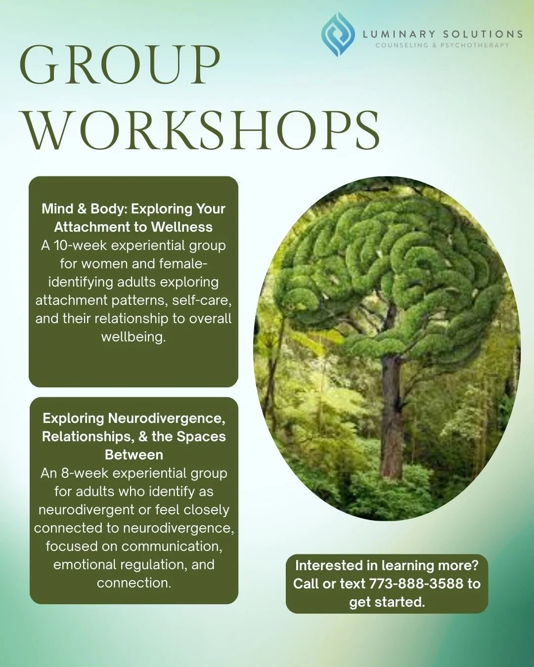 Luminary Solutions is launching a new series of group workshops starting in late February. These interactive sessions are designed to build practical skills, spark fresh thinking, and support meaningful growth in a collaborative environment. Join us to learn, connect, and move forward with clarity and confidence. Text the number below or fill out the Interest Form